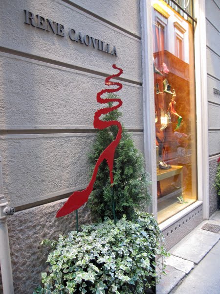 Rene Caovilla, which means shoes, shoes and more shoes. If the red logo isn't enough of an indication then the delightful window display - my god but Italians know how to dress windows - leaves no doubt. And though those fanciful little numbers hanging in the window are strictly for display they does have some serious shoes for sale. Including those little studded numbers which can be all yours for only €595,00 (CAD797.37 - USD776.32)- obviously they weren't on the July sales list.