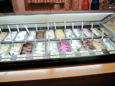 There were 22 flavour available and though each was labelled - sometimes using a play on words - there were also little indications of the ingredients on each tub - a piece of fruit, a wine cork, a pod or spring of what had been turned into icy goodness. And though my two favourites, Pistacchio and Caffé, seemed to be missing a few of the old standards were there - Strawberry, Chocolate, Pear and Cream. However you don't go to Gelati DiVini for the standard flavours - you go for the unusual and unusual they were offering. How does Ricotta, Cardamon or Date gelato sound? Or how about Beet, Peppered Chocolate or Carob? Or Moscato, Rose or Marsala for those of us that like the idea of the mix of Gelatoria and Enotecha?